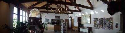 The visitor center displays an extensive collection of Wyoming wildlife mounts, including fish, birds, small mammals, and life-size bear representations.