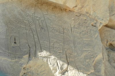 The petroglyphs display circular shields, water turtles, human figures, and animal designs that represent the artistic methods of ancient Wyoming inhabitants.