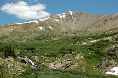 The mountain sits along the Continental Divide, offering views of Peru Creek while integrating former mining roads into the present-day Continental Divide Trail.