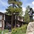 The wooden Kauffman House stands near the lake shore, featuring rounded exterior logs and traditional fish-scale shingles on its gables.