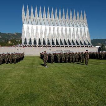 The Cadet Area of the United States Air Force Academy is a military complex with classroom buildings, training facilities, and dormitories arranged around a central square called the Terrazzo. The site also includes the Cadet Chapel with its distinctive aluminum spires and serves as the hub for cadet education and daily activities.