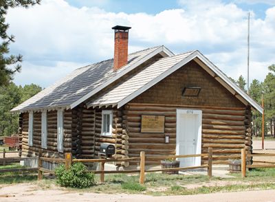 The Black Forest School building measures 32 by 22 feet, constructed from Ponderosa logs with a red brick chimney and wooden floor elements.
