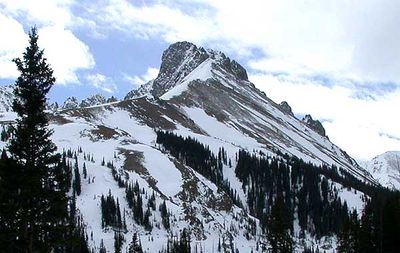 The rocky spires of Nokhu Crags reach an elevation of 12,484 feet within the Never Summer Mountains range of the Rocky Mountains.