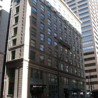 The limestone-clad Bank Lofts building stands at 40 meters tall on 17th Street, featuring bronze storefronts and classical architectural details throughout its structure.