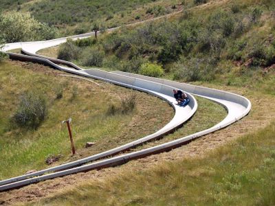 The Alpine Slide, visible from nearby highways, carried visitors down the mountain slope in individual carts on a dedicated track.