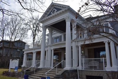 The John Daly House features a white exterior with sandstone on the first floor, stucco on the upper level, and Corinthian pillars at the entrance.