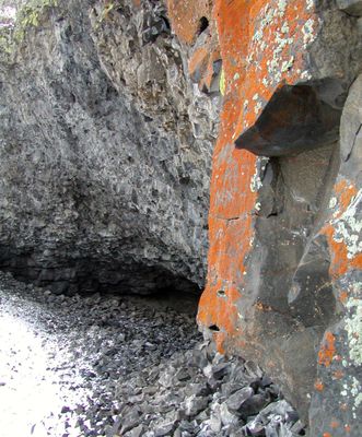 The largest cave lies 0.8 miles from the trailhead, measuring between 10 to 20 feet deep, and contains walls marked with distinct lichen patterns.