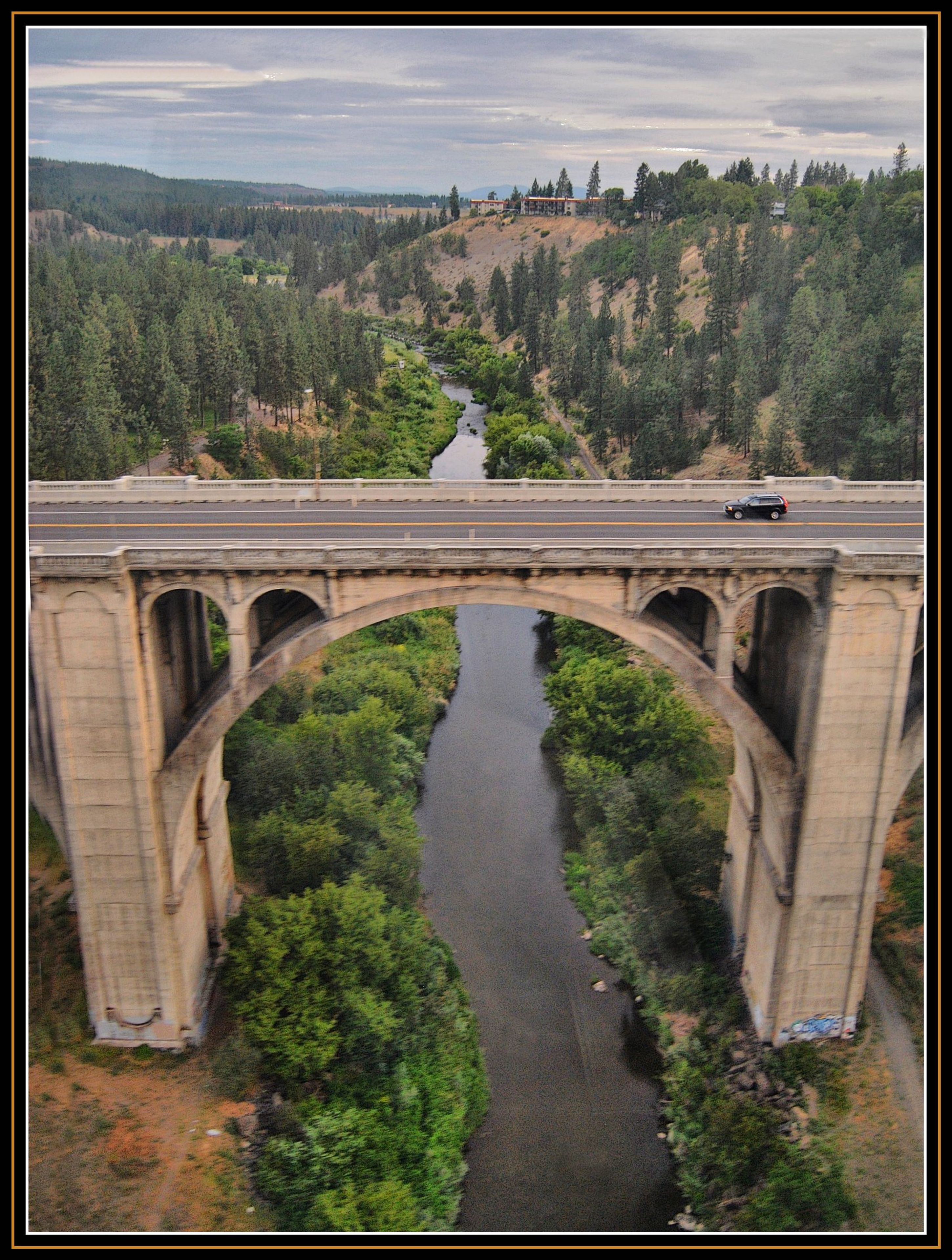 The Sunset Boulevard Bridge stretches 1,070 feet across Latah Creek, featuring seven semi-circular arches that connect Browne's Addition to Downtown Spokane and West Hills.