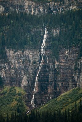 The waterfall flows from snowfields and a glacier on Mount Oberlin's slopes, marking the natural boundary between the continental divide in Glacier National Park.