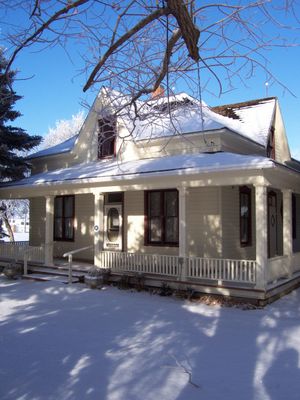 The farmstead includes a Victorian-style house with seven rooms, a wraparound porch, and several outbuildings including a barn, granary, and storage cellar.