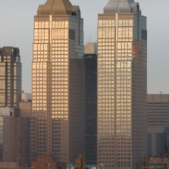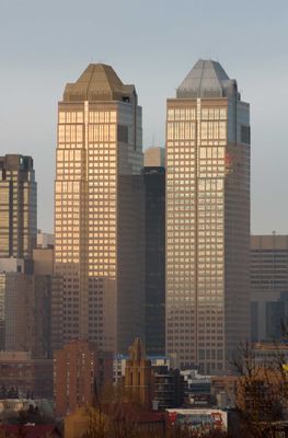 The Bankers Hall complex consists of two identical 52-story skyscrapers, each reaching a height of 197 meters in the center of Calgary.