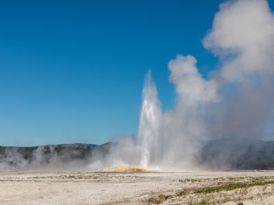 Located at an elevation of 7,254 feet, Clepsydra Geyser releases continuous eruptions of water reaching heights of 45 feet into the Wyoming sky.
