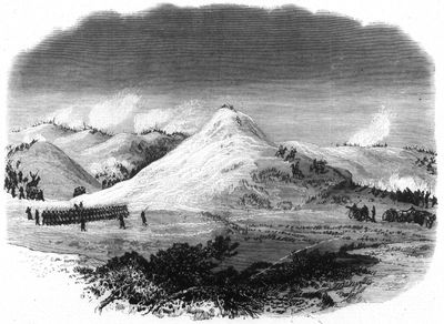 The battlefield includes visible military structures, such as the rifle pit constructed by Company F of the Twenty-second Infantry atop a rock wall.