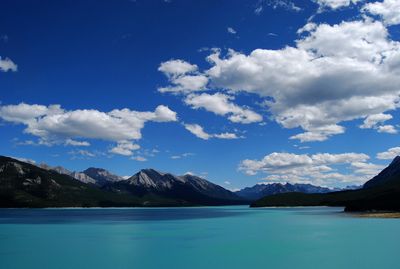 Abraham Lake is a reservoir along the North Saskatchewan River in Alberta, Canada, stretching 32 kilometers (20 miles) through the mountains. The water reaches depths of 100 meters (330 feet) and glows turquoise in the sunlight.