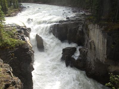 The Sunwapta Falls cascade forms two tiers along the Sunwapta River, dropping 18.5 meters through a limestone gorge in the Canadian Rockies.
