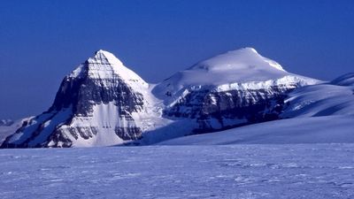 South Twin rises to an elevation of 3,566 meters, forming part of The Twins massif at the northeastern corner of the Columbia Icefield in Alberta.