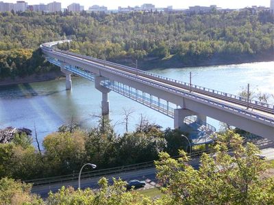 The Dudley B. Menzies Bridge extends 530 meters across the North Saskatchewan River, supporting two tracks for the Edmonton Light Rail Transit system.