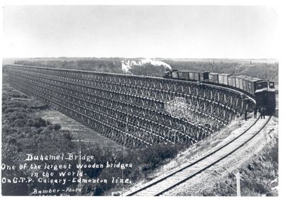The wooden trestle bridge crossed the Battle River Valley with a length of 4,000 feet and reached a height of 120 feet.