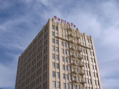 The Santa Fe Building presents a Gothic Revival architectural design with pointed arches, ribbed vaults, and decorative stone elements throughout its exterior facade.