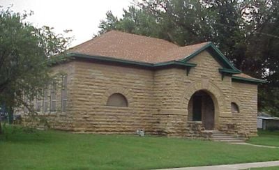 The two-room sandstone building features a hipped roof covered with asphalt and metal one-over-one double-hung windows with protective mesh covers.