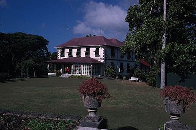 Francia Great House is an early 20th-century residence near Gun Hill Signal Station, standing on a wooded hillside surrounded by terraced gardens. It features a triple-arched entrance and an enclosed upper balcony constructed from coral stone and wood craftsmanship.