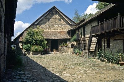 Ayios Ioannis is a Byzantine monastery with three connected churches whose interior stone walls are covered with frescoes depicting religious scenes and holy figures. The spaces flow into one another through doorways and narrow passages, creating an intricate layout centered around an inner courtyard.