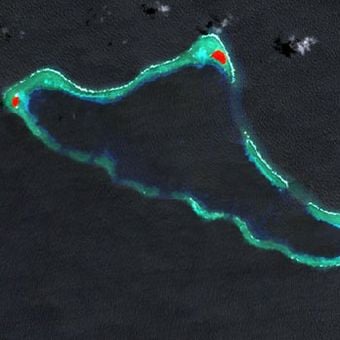 Lamotrek is an atoll made up of three islands sitting in a Pacific lagoon at a very low elevation above sea level. The islands are scattered across the water with shallow channels running between them, creating a fragmented land mass.