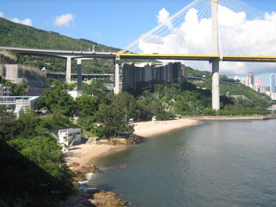 Casam Beach is a sandy stretch in Tsuen Wan positioned next to Lido Beach with views of the Ting Kau Bridge northern abutment and Tsing Ma Bridge. The shoreline extends roughly 200 meters along Castle Peak Road.