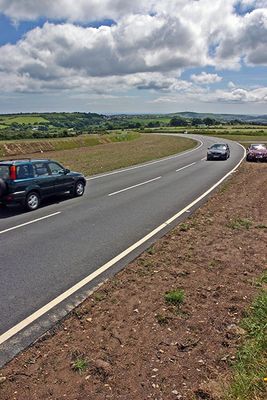 The road curve stretches along the primary A18 Mountain Road between the 35th and 36th milestone markers in the parish of Onchan.
