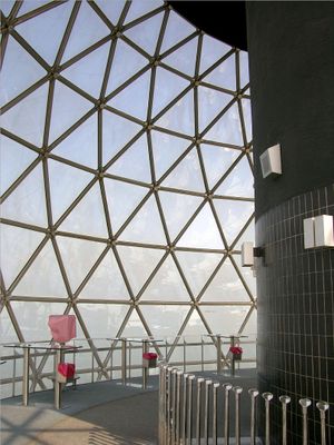 The spheres carry more than 41,000 enameled steel discs arranged in spiral patterns that reflect differently as the day progresses. From many points in the city, these geometric forms remain clearly visible.