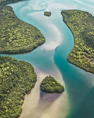 The waters contain several islands, such as Massatin Island, which provide habitats for native monkey populations and diverse bird species.