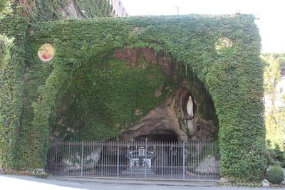 The Grotta di Lourdes is an artificial cave structure in the Vatican Gardens modeled after the French original in Lourdes. The construction features stone walls and a statue of the Virgin Mary positioned within the grotto space.