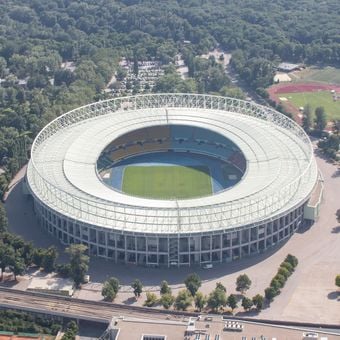 The Ernst Happel Stadium stands in the Prater recreational area near the Danube river, featuring a running track around its main football field.