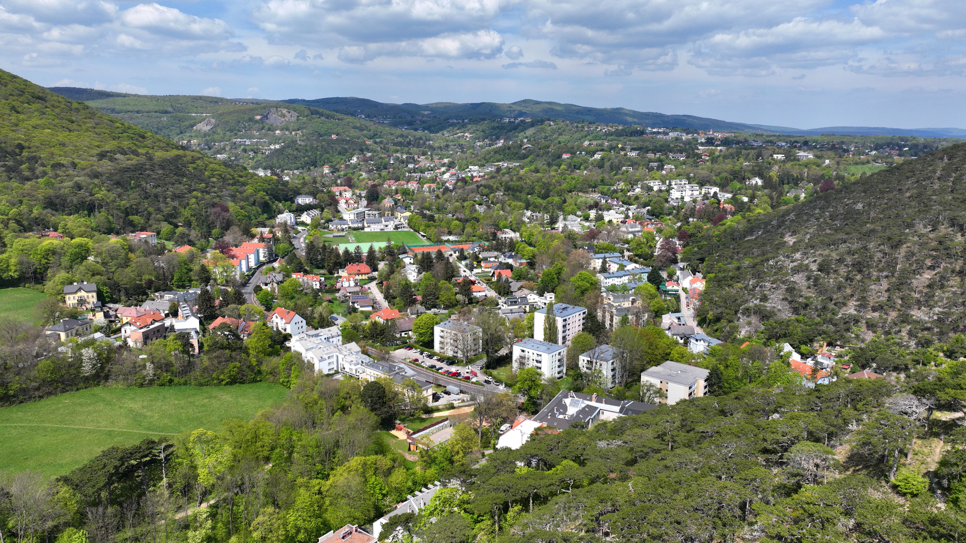 Hinterbrühl stretches across the southeastern region of Austria, surrounded by the natural landscapes of the Wienerwald forest and residential neighborhoods.