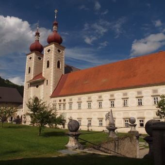 The monastic complex stands at 1,072 meters elevation within the Styrian Grebenzen nature reserve, featuring two churches and extensive gardens.