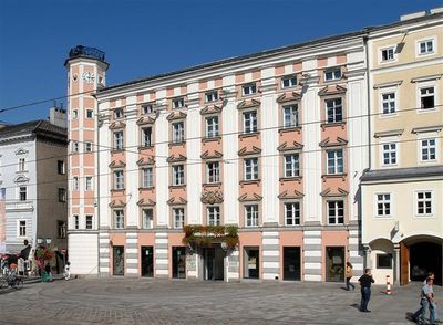 The Old Town Hall features an arcaded courtyard with stone columns and rises prominently on the eastern side of the central square of Linz.