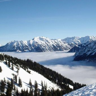 Fellhorn is a 2038 meter mountain peak in the Allgäu Alps forming the border between Bavaria and Vorarlberg. It is served by a network of cable cars and lifts that connect skiing areas on both the German and Austrian sides.