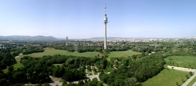 Donaupark extends over 632,000 square meters between the main Danube and Old Danube, featuring extensive gardens, sports areas, and recreational facilities.