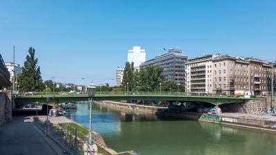The Aspernbrücke extends across the Danube Canal, connecting the districts of Innere Stadt and Leopoldstadt through multiple traffic lanes and pedestrian paths.