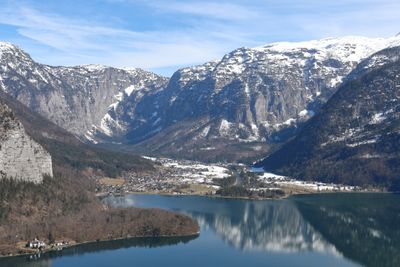 Located at the foot of Dachstein mountain, Obertraun extends along the Hallstätter See lake with mountains rising on both sides of the valley.