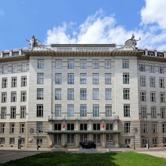 The Austrian Postal Savings Bank is an eight-story banking institution with a white marble facade and characteristic aluminum rivets that create a continuous grid pattern. The central hall features a glass floor that allows natural light to reach lower levels while serving as the main transaction area.