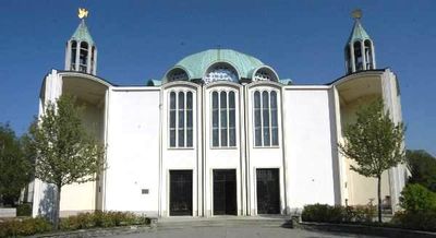 Gatterhoelzl-Kirche is a Catholic church in Meidling with a distinctive circular structure topped by a dome and flanked by two bell towers. The building combines concrete and brick construction for its modern design from the mid-20th century.