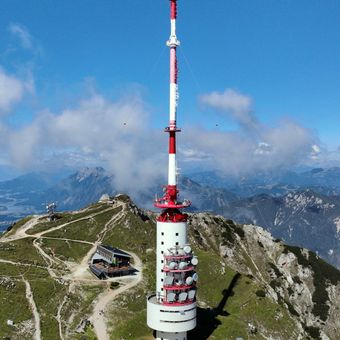 The tower broadcasts radio signals with 125,000 watts of power and reaches listeners across Austria, Italy, and Slovenia. This cross-border coverage makes it an important transmission point for the entire region.