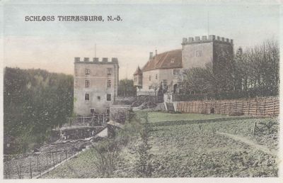 Schloss Therasburg stands on a ridge overlooking the Therasburger stream, with its white sandstone portal and stone bridge marking the entrance.