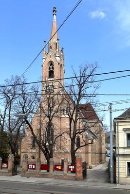 St. Andreas is a parish church in Vienna's Penzing district designed in the Gothic Revival style with pointed arches and decorative window patterns. The building displays lancet windows and ornamental details that reference medieval construction methods.
