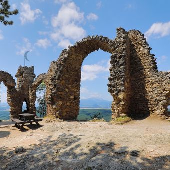 The Türkensturz is an artificial ruin built on top of a steep limestone cliff with views across the Lower Austrian landscape below. The structure mimics the appearance of a crumbling fortress through carefully arranged stone walls and openings.
