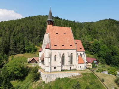 The Church of St. Wolfgang is a Gothic house of worship located in Kirchberg am Wechsel, featuring pointed arch windows and stone vaulted ceilings. The structure displays typical medieval construction methods seen in ribbed vaults and thick stone walls that remain well-defined today.