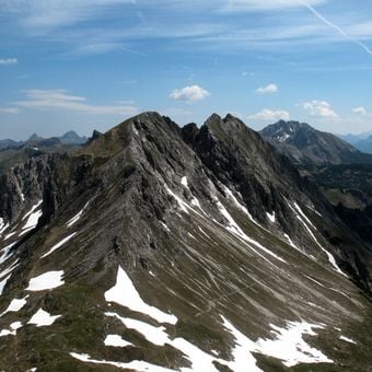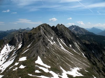 The mountain forms part of the Kastenköpfe massif, with its western neighbor peak reaching 2129 meters and offering views of the Schrecksee lake.