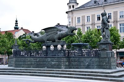 The Lindwurmbrunnen features a large dragon statue carved from greenschist, with water flowing from its open mouth and wings pressed against its body.
