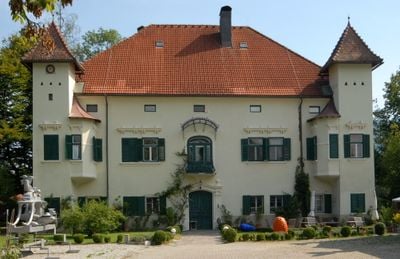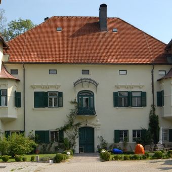 Two small corner towers on the western facade received quarter-circle bay windows around 1900, along with a Secessionist-style facade and balcony above the entrance.